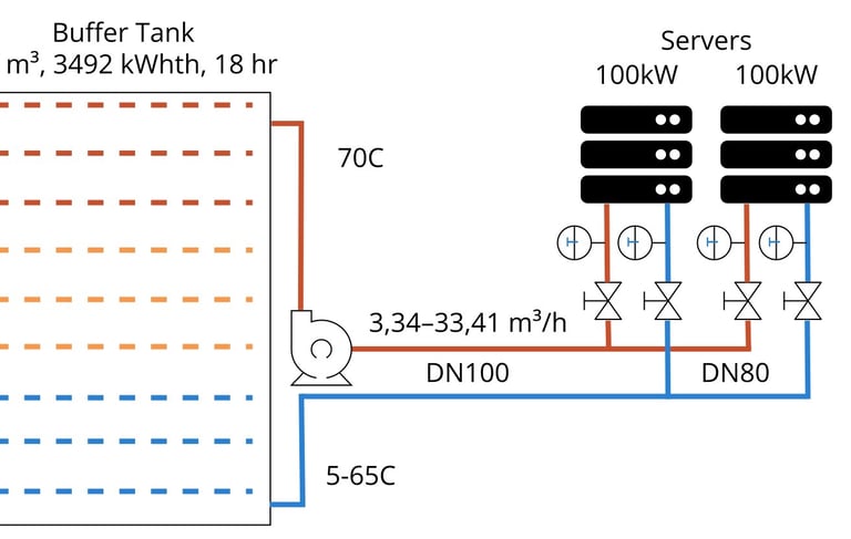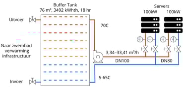 Wij hebben een innovatief verwarmingssysteem ontworpen voor een Nederlands zwembad, waarbij een 200 kW watergekoeld serverrack is geïntegreerd om 194 kWth bij 70 °C te leveren aan een buffervat van 76 m³, dat de verwarmingsinfrastructuur van het zwembad voedt. Het systeem, verdeeld over twee serverracks zorgt voor efficiënte warmteoverdracht. Deze duurzame oplossing vervangt de op gas gebaseerde verwarming, bespaart ongeveer 356 m³ aardgas per dag en vermindert de CO₂-uitstoot met 328 ton per jaar.